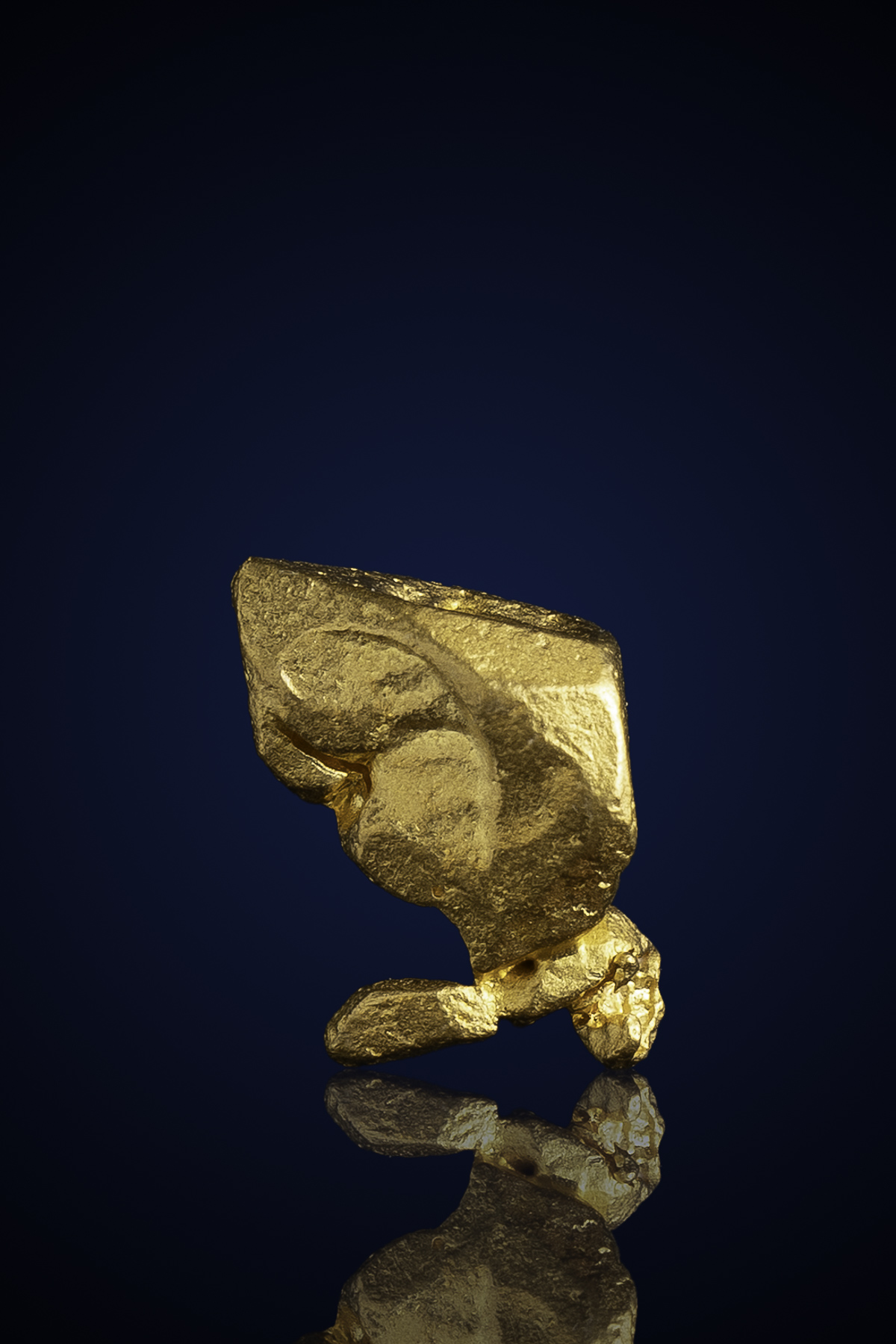 This exceptional Venezuelan gold nugget stands out for its bold, geometric form and naturally sculpted structure, giving it the appearance of a miniature golden monument shaped by time. Unlike rounded river-worn nuggets, this piece retains sharp planes, deep grooves, and angular contours that reveal its journey from bedrock to placer deposit, preserving its crystallized geometry.