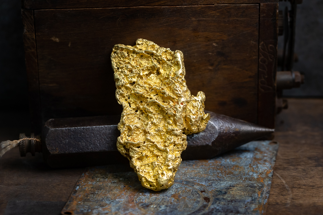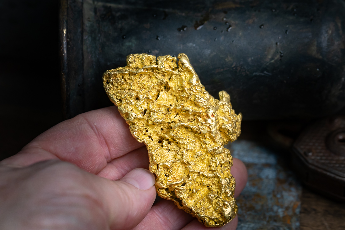 Only about 2% of the gold in the world is in “gold nugget” form and the other 98% is microscopic speck and flake gold found in ore. A good gold ore today will have about one ounce of gold for every two tons of rock.