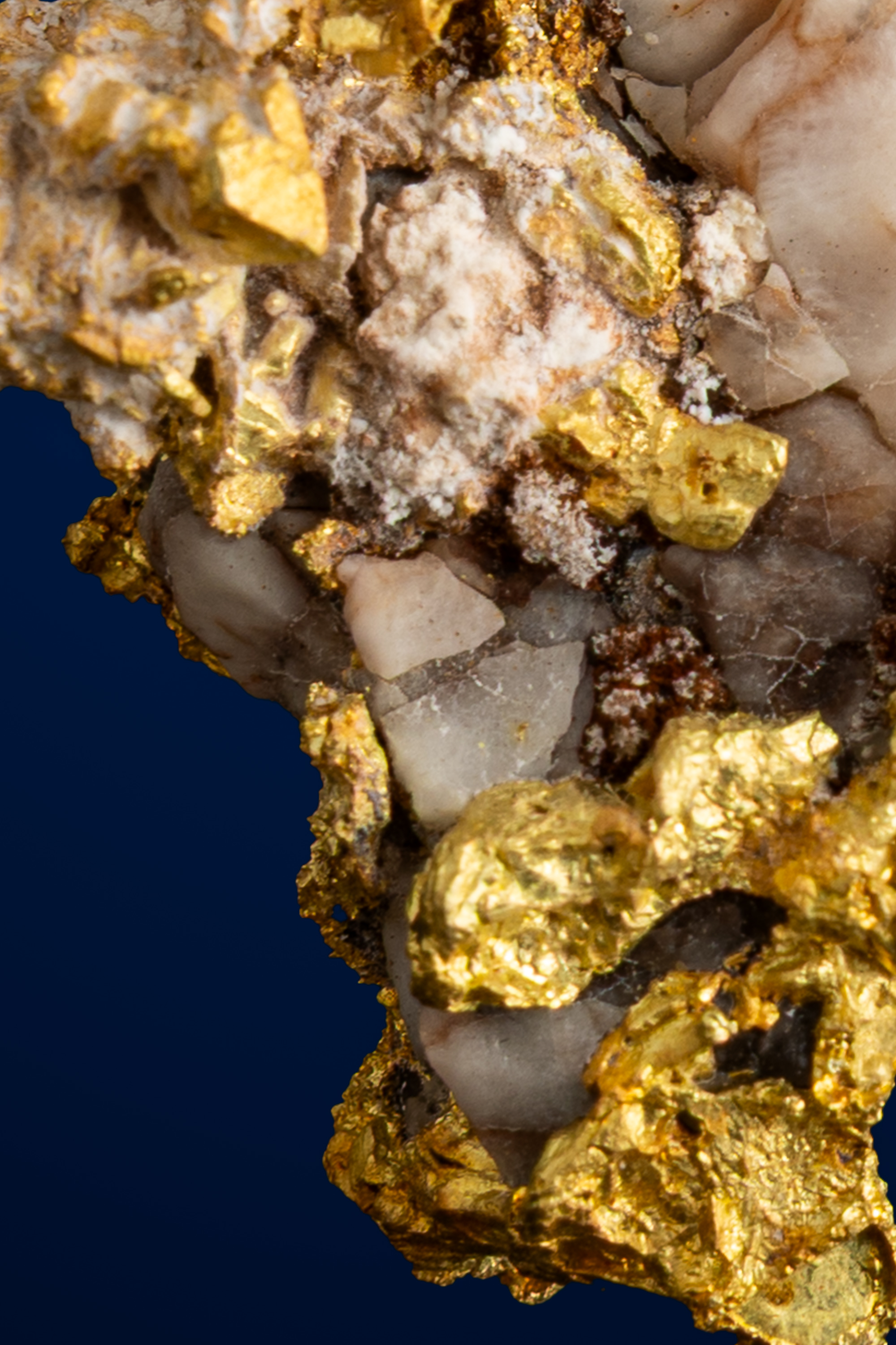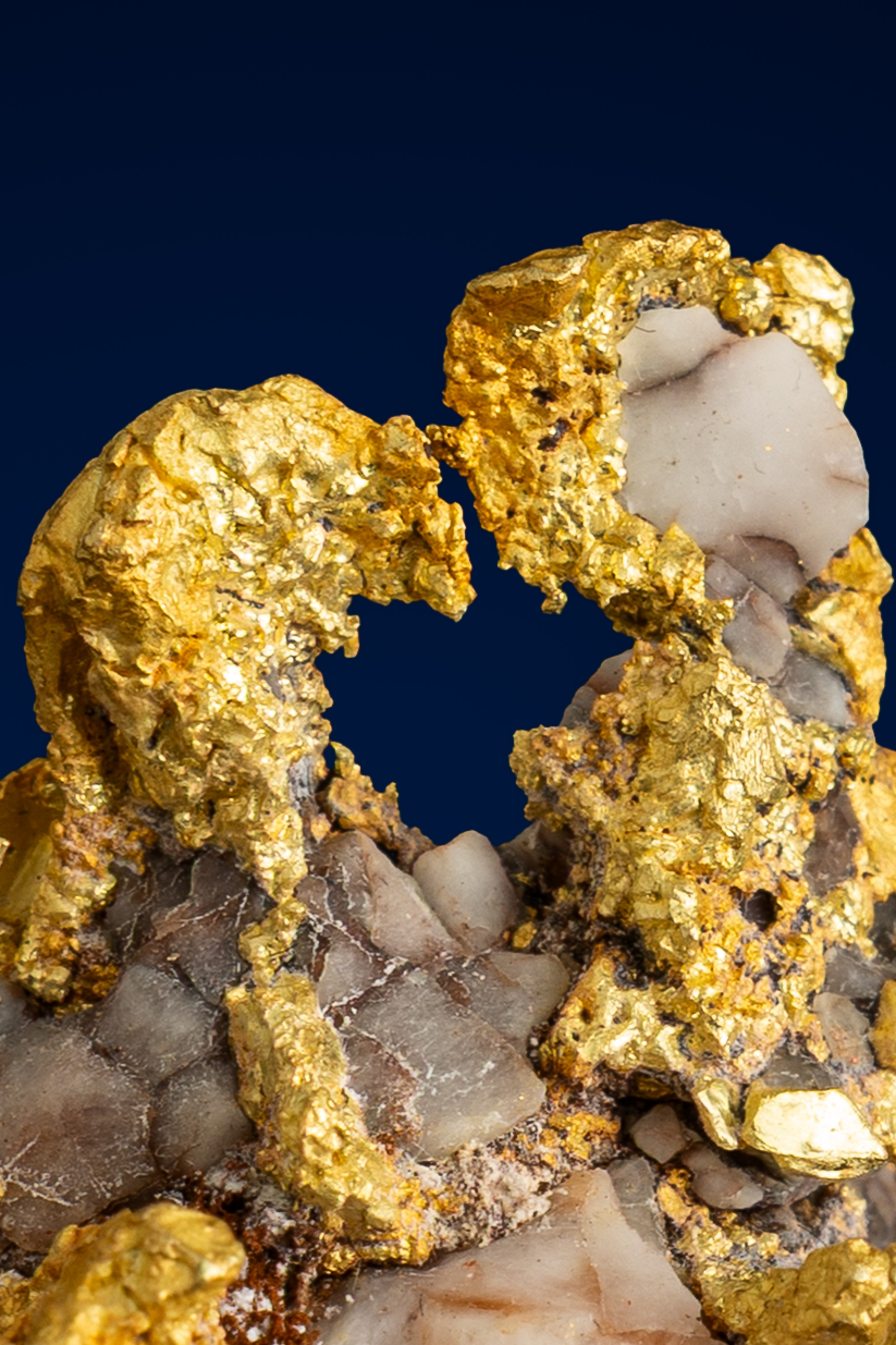 This exceptional gold-in-quartz specimen from California is a striking example of the natural partnership between native gold and its host matrix. Rich, buttery gold winds its way through a rugged framework of milky white and smoky quartz, creating a dramatic contrast that immediately captures the eye. The gold occurs in irregular, branching formations, with a textured, crystalline surface that glows warmly against the cooler tones of the quartz.