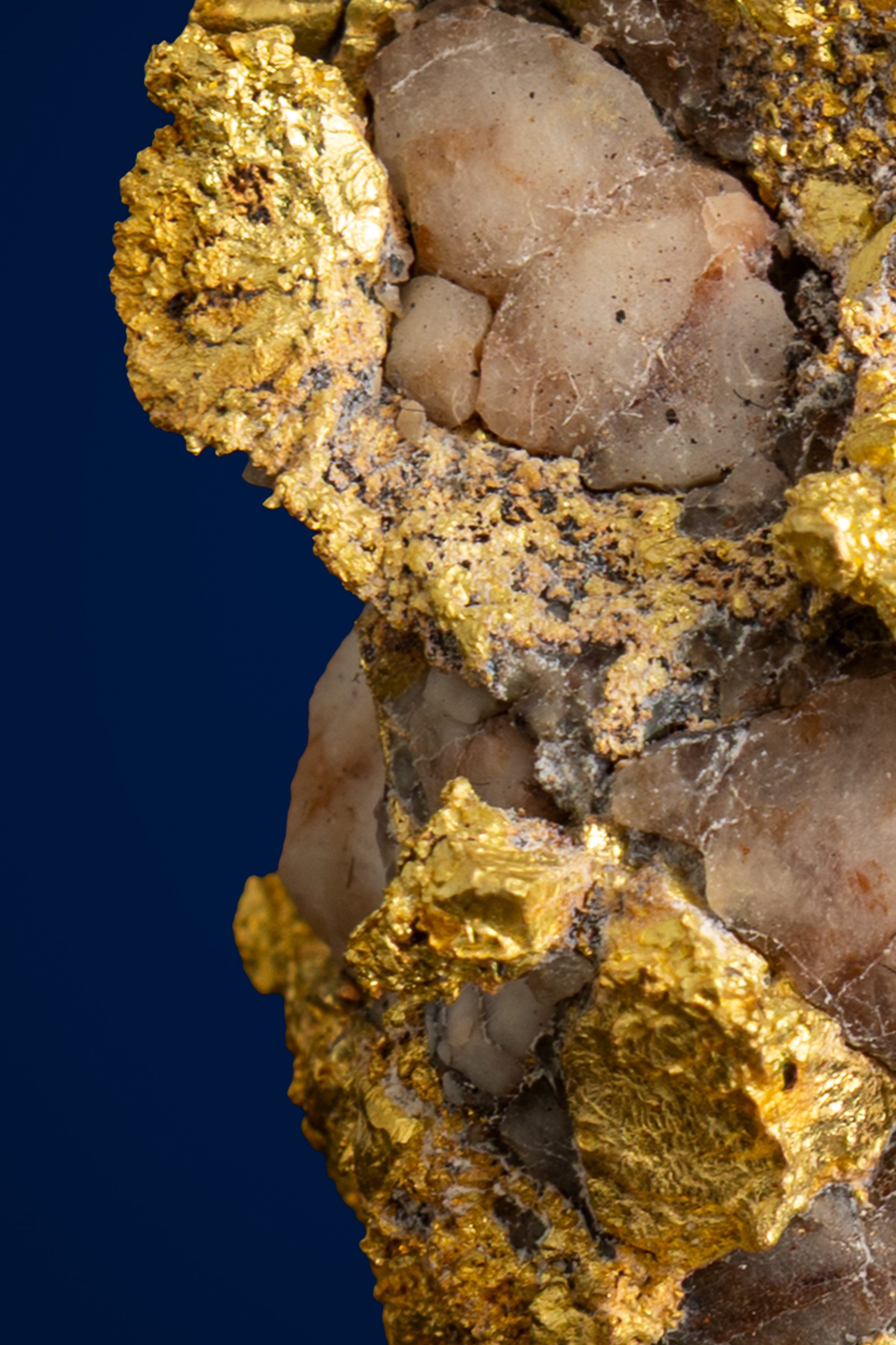 The specimen displays impressive dimensionality, with pockets, ridges, and open spaces that give it a sculptural, almost architectural presence. Areas of coarse gold appear perched atop and embedded within the quartz, suggesting strong lode origins and minimal transport. Subtle iron staining and mineralization add depth and character, enhancing the piece’s natural, unrefined beauty.